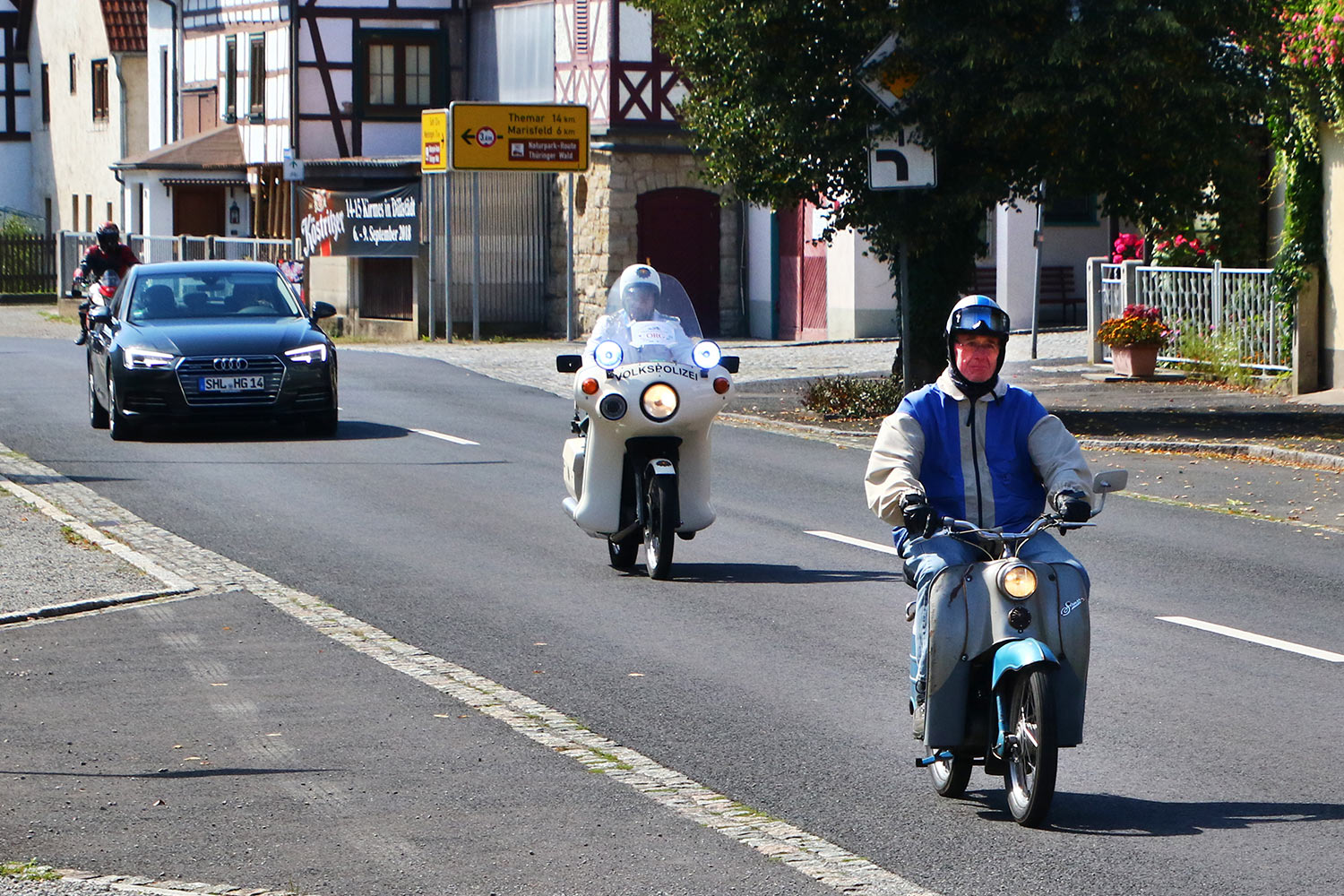 Lag der Schwerpunkt der Suhler Veranstaltung bisher vorwiegend bei Vorkriegsfahrzeugen, sind es in diesem Jahr auch Motorräder aller Typen bis Baujahr 1988. Dabei sind sicherlich auch viele Teilnehmer des diesjährigen MZA-Simson-Treffens vom Juli in Suhl-Goldlauter. Übrigens ist es eine Legende, wonach die sicher wieder zahlreich vertretenen Simson- und AWO-Motorräder Heimvorteil haben, da diese die Route bereits kennen. Allerdings wurden in den Anfangsjahren der Produktion die Motorräder im normalen Straßenverkehr vor der Auslieferung noch einige Kilometer „eingefahren“. Und genau diese festgelegten Strecken von damals sind ein Teil der ca. 100-km-Tour durch den Thüringer Wald. Start der Wertungsfahrt ist am Suhler Marktplatz, direkt vor dem Rathaus. Oberbürgermeister André Knapp wird die Teilnehmer auf die Strecke schicken und sie ein Stück des Weges begleiten. Ein Höhepunkt wird sicherlich gegen 10 Uhr die Fahrt durch den Suhler Steinweg sein. Ziel der Veranstaltung ist dann am Nachmittag gegen 16 Uhr der Platz der Deutschen Einheit, wo die Fahrzeuge anschließend präsentiert werden.
