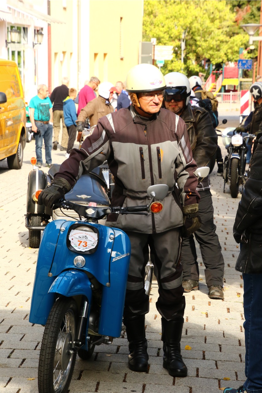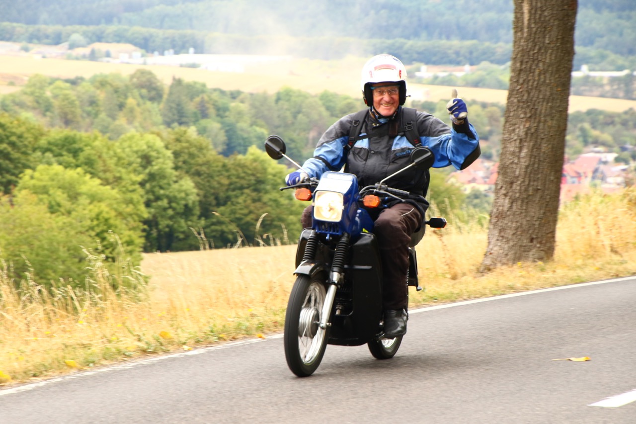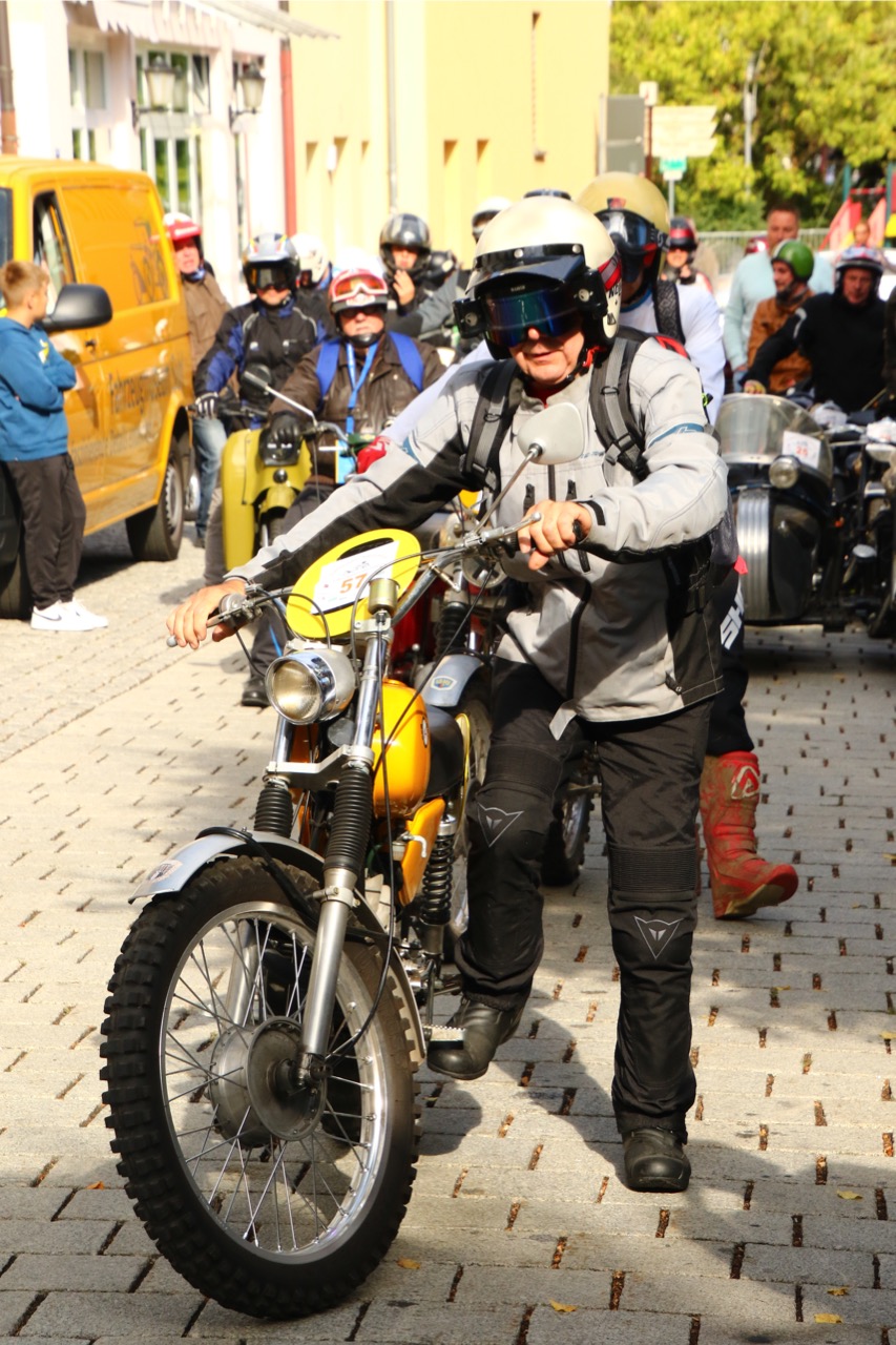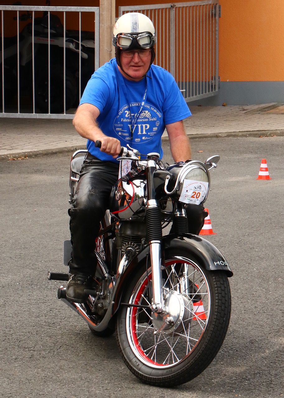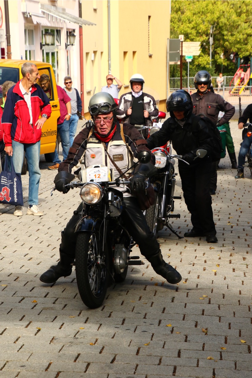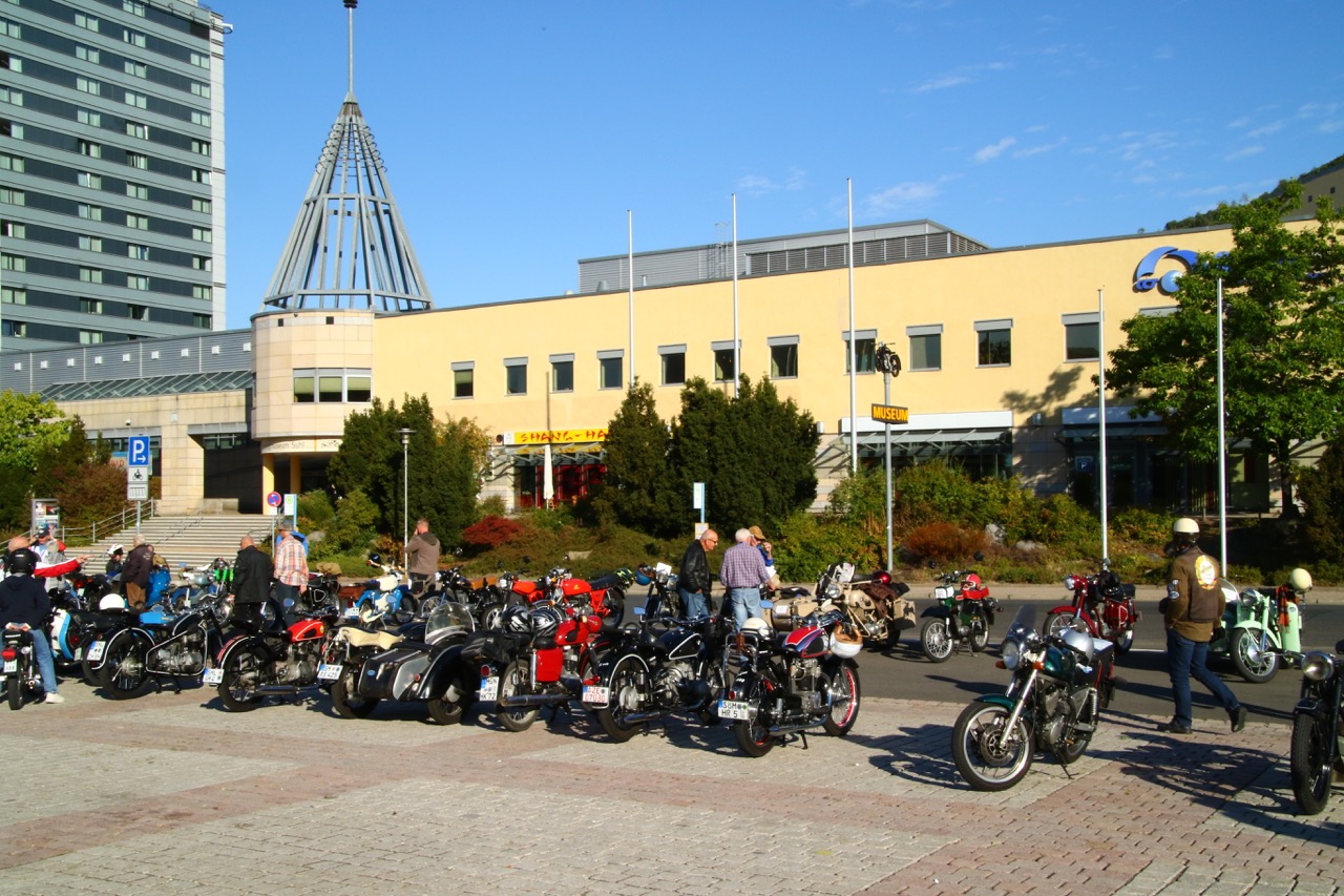Wenn Anfang September in der Fußgängerzone von Suhl schwere Viertaktmotore ihren tiefen Sound fortissimo hämmern, Simson-Werksenduros Drehzahlorgien gen Himmel schicken und japanische Präzionstriebwerke in mezzopiano vor sich hinwerkeln ist wieder Oldtimerfahrt und Ausnahmezustand im Fahrzeugmuseum Suhl. Die Freunde alter Motorräder huldigen ihrem Hobby und feiern einen Oldtimer- Festtagtag rund um Suhl auf den malerischen Bergstraßen des Thüringer Waldes. Mittlerweile gehört die Oldtimerfahrt Suhl bereits zur Tradition und auch die Auswahl des 03. Septembers für die 14. Auflage erwies sich als Glücksfall. Bestes Motorradwetter mit wenigen Regentropfen zwischendurch herrliche Strecken versteckt zwischen Bergen, einsamen Tälern und malerischen Ortschaften im Thüringer Waldes schienen an diesem Tag wie extra aufpoliert für die Teilnehmer mit ihren tollen Oldtimern. Aus vielen Teilen Deutschlands waren sie angereist und von der Simson Schwalbe bis zur Honda Goldwing war so ziemlich alles vertreten, was in dieser Welt zwischen 1926 und 1992 Motorradgeschichte geschrieben hat. Von Ein- bis Vierzylinder von A wie AWO bis Z wie Zündapp reichte das Spektrum des bunten Feldes. Man konnte meinen sie wären an diesem einen Tag nur zusammengekommen um den staunenden und begeisterten Zuschauern an der Strecke ein rollendes Museum zu präsentieren. (Text: Dr.Hartmut Göbel)