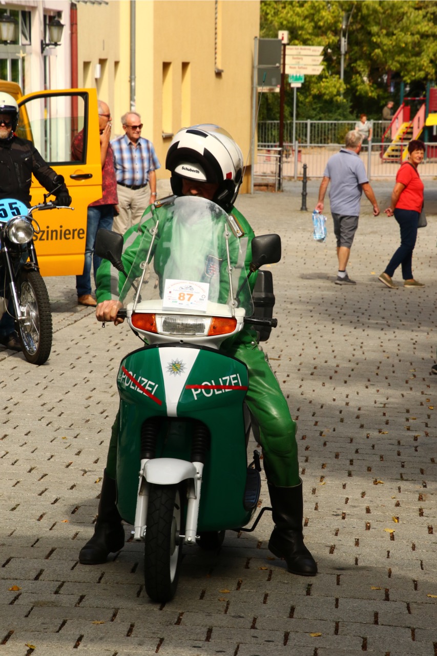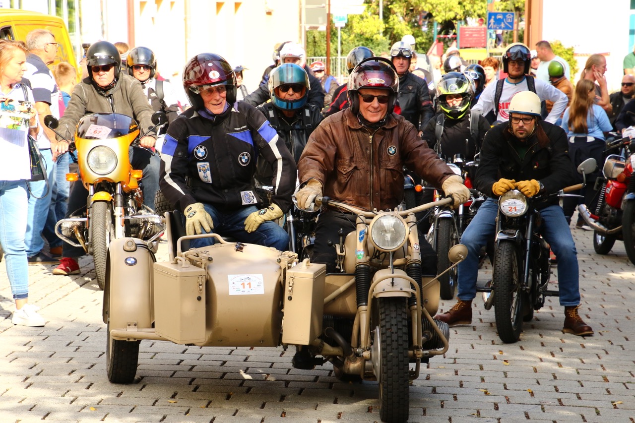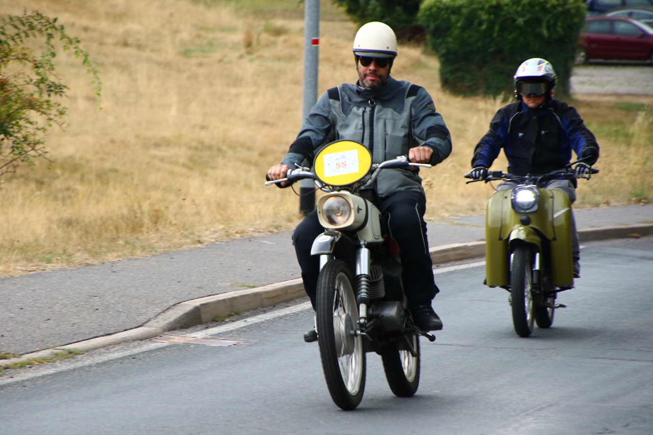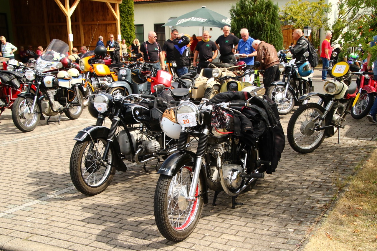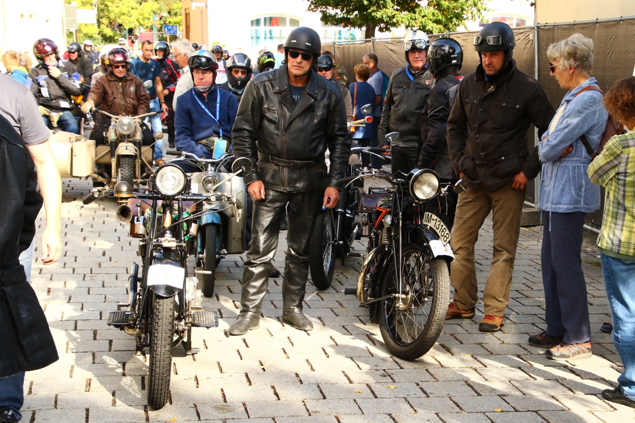 Wenn Anfang September in der Fußgängerzone von Suhl schwere Viertaktmotore ihren tiefen Sound fortissimo hämmern, Simson-Werksenduros Drehzahlorgien gen Himmel schicken und japanische Präzionstriebwerke in mezzopiano vor sich hinwerkeln ist wieder Oldtimerfahrt und Ausnahmezustand im Fahrzeugmuseum Suhl. Die Freunde alter Motorräder huldigen ihrem Hobby und feiern einen Oldtimer- Festtagtag rund um Suhl auf den malerischen Bergstraßen des Thüringer Waldes. Mittlerweile gehört die Oldtimerfahrt Suhl bereits zur Tradition und auch die Auswahl des 03. Septembers für die 14. Auflage erwies sich als Glücksfall. Bestes Motorradwetter mit wenigen Regentropfen zwischendurch herrliche Strecken versteckt zwischen Bergen, einsamen Tälern und malerischen Ortschaften im Thüringer Waldes schienen an diesem Tag wie extra aufpoliert für die Teilnehmer mit ihren tollen Oldtimern. Aus vielen Teilen Deutschlands waren sie angereist und von der Simson Schwalbe bis zur Honda Goldwing war so ziemlich alles vertreten, was in dieser Welt zwischen 1926 und 1992 Motorradgeschichte geschrieben hat. Von Ein- bis Vierzylinder von A wie AWO bis Z wie Zündapp reichte das Spektrum des bunten Feldes. Man konnte meinen sie wären an diesem einen Tag nur zusammengekommen um den staunenden und begeisterten Zuschauern an der Strecke ein rollendes Museum zu präsentieren. (Text: Dr.Hartmut Göbel)