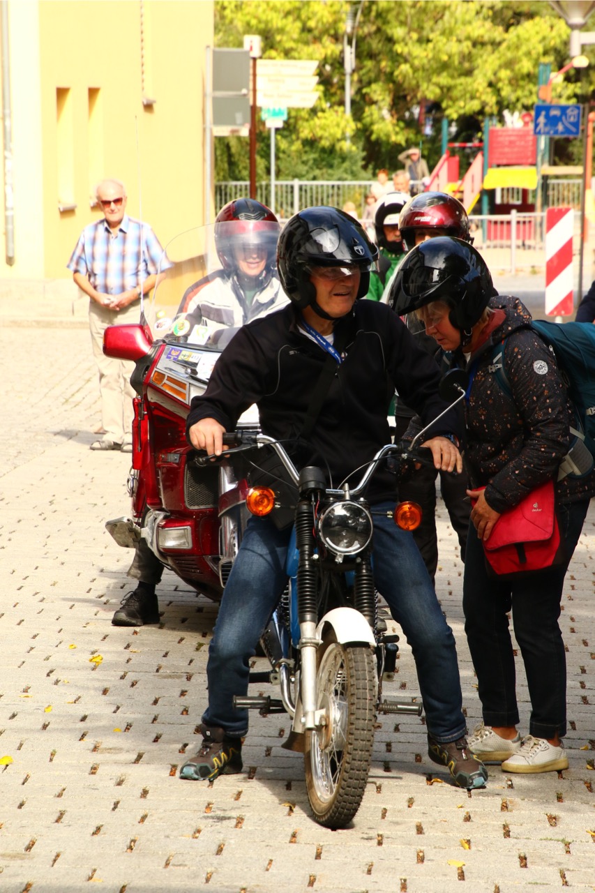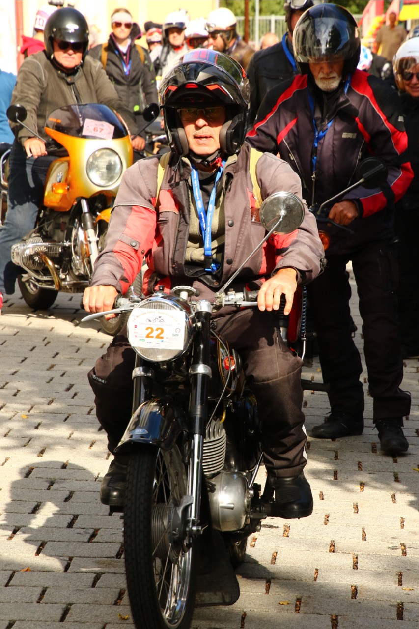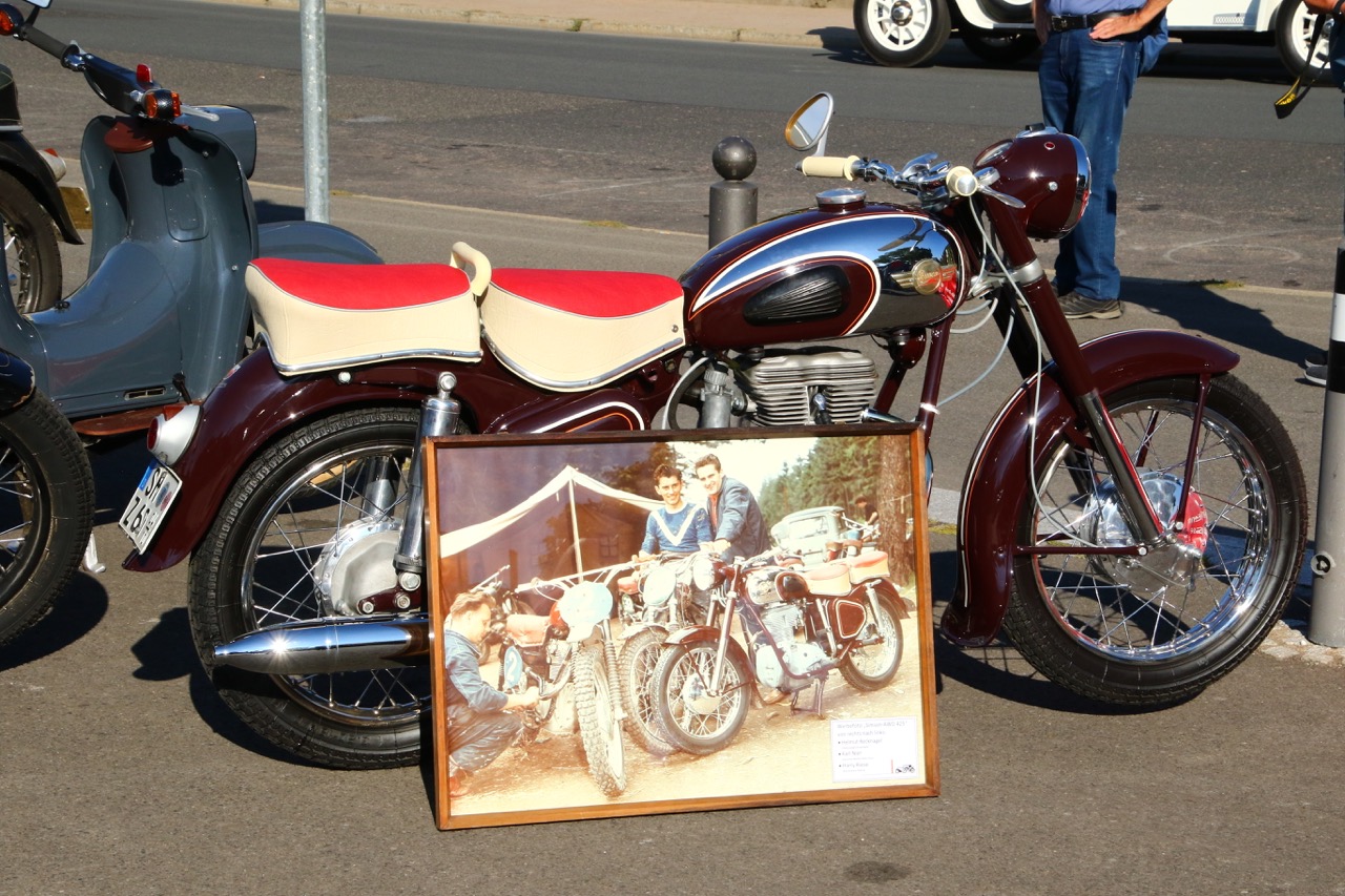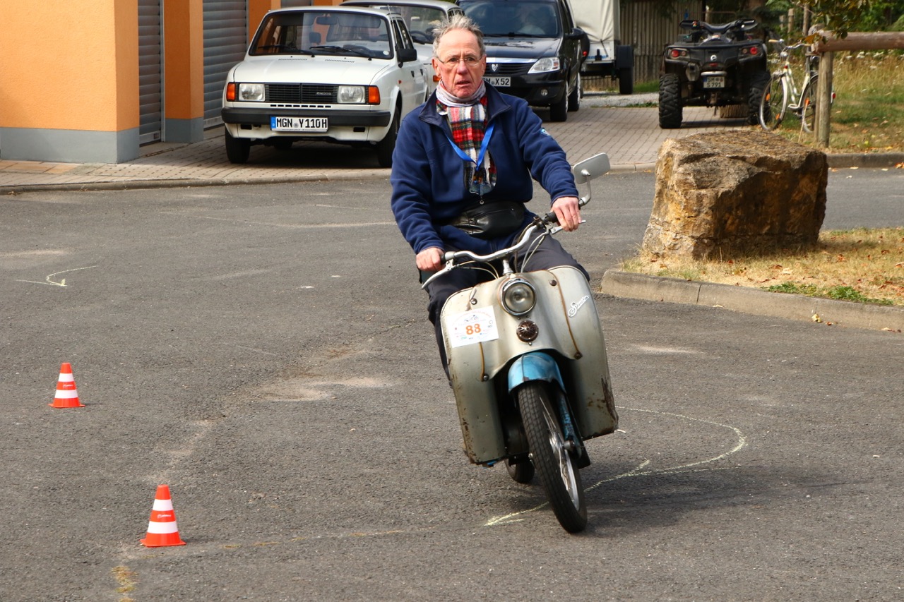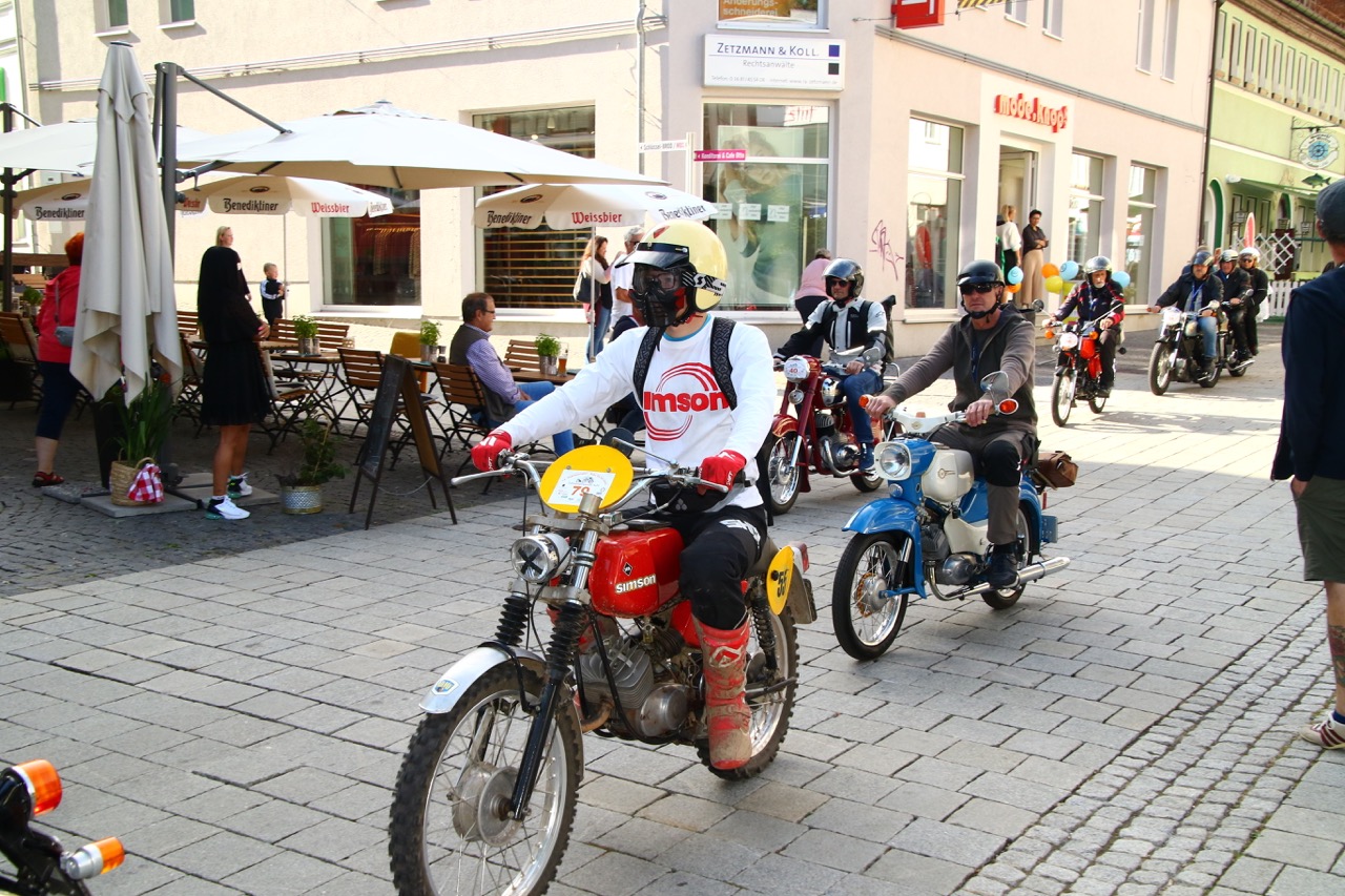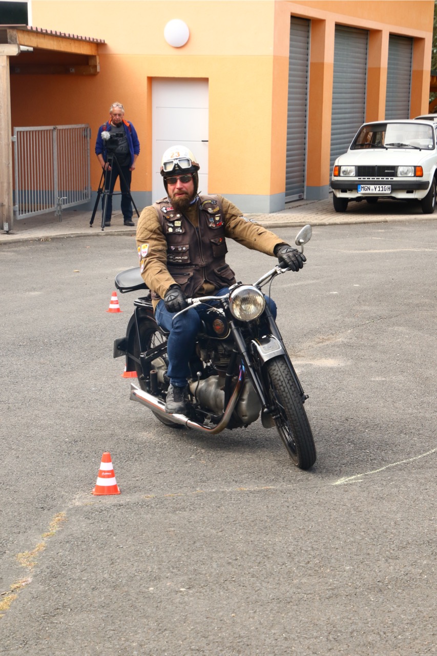 Wenn Anfang September in der Fußgängerzone von Suhl schwere Viertaktmotore ihren tiefen Sound fortissimo hämmern, Simson-Werksenduros Drehzahlorgien gen Himmel schicken und japanische Präzionstriebwerke in mezzopiano vor sich hinwerkeln ist wieder Oldtimerfahrt und Ausnahmezustand im Fahrzeugmuseum Suhl. Die Freunde alter Motorräder huldigen ihrem Hobby und feiern einen Oldtimer- Festtagtag rund um Suhl auf den malerischen Bergstraßen des Thüringer Waldes. Mittlerweile gehört die Oldtimerfahrt Suhl bereits zur Tradition und auch die Auswahl des 03. Septembers für die 14. Auflage erwies sich als Glücksfall. Bestes Motorradwetter mit wenigen Regentropfen zwischendurch herrliche Strecken versteckt zwischen Bergen, einsamen Tälern und malerischen Ortschaften im Thüringer Waldes schienen an diesem Tag wie extra aufpoliert für die Teilnehmer mit ihren tollen Oldtimern. Aus vielen Teilen Deutschlands waren sie angereist und von der Simson Schwalbe bis zur Honda Goldwing war so ziemlich alles vertreten, was in dieser Welt zwischen 1926 und 1992 Motorradgeschichte geschrieben hat. Von Ein- bis Vierzylinder von A wie AWO bis Z wie Zündapp reichte das Spektrum des bunten Feldes. Man konnte meinen sie wären an diesem einen Tag nur zusammengekommen um den staunenden und begeisterten Zuschauern an der Strecke ein rollendes Museum zu präsentieren. (Text: Dr.Hartmut Göbel)
